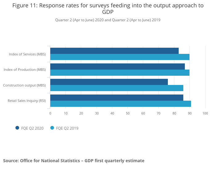 Image .csv .xlsFigure 11 and Figure 12 highlight a decline in response rates for surveys that feed into the GDP first quarterly estimate for Quarter 2 (Apr to June) 2020. We have undertaken a significant amount of work to ensure that the effect on the quality of estimates in this release are mitigated as much as possible.