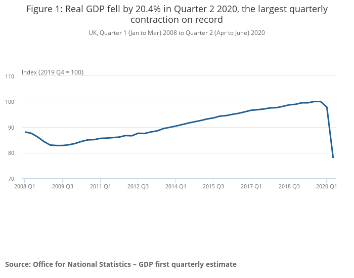 UK gross domestic product (GDP) is estimated to have fallen by a record 20.4% in Quarter 2 (Apr to June) 2020, marking the second consecutive quarterly decline after it fell by 2.2% in Quarter 1 (Jan to Mar) 2020.