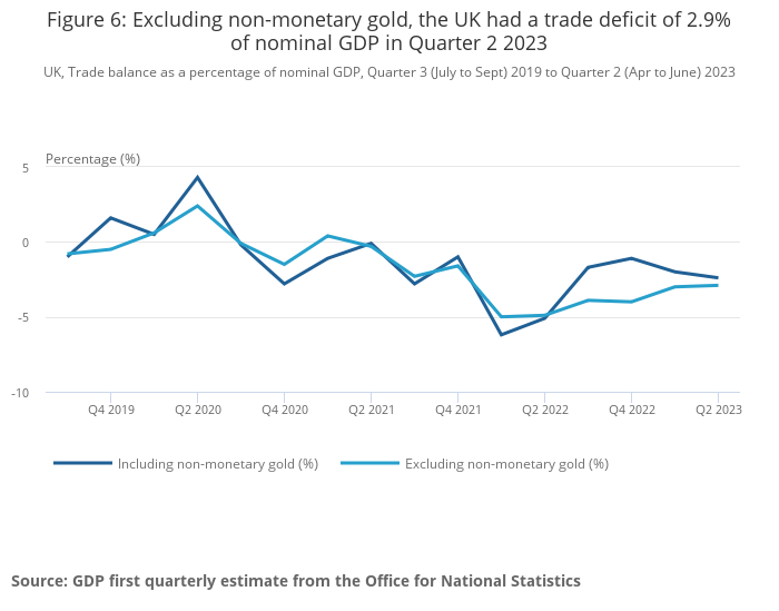 Figure 6: Excluding non-monetary gold, the UK had a trade deficit of 2.9% of nominal GDP in Quarter 2 2023