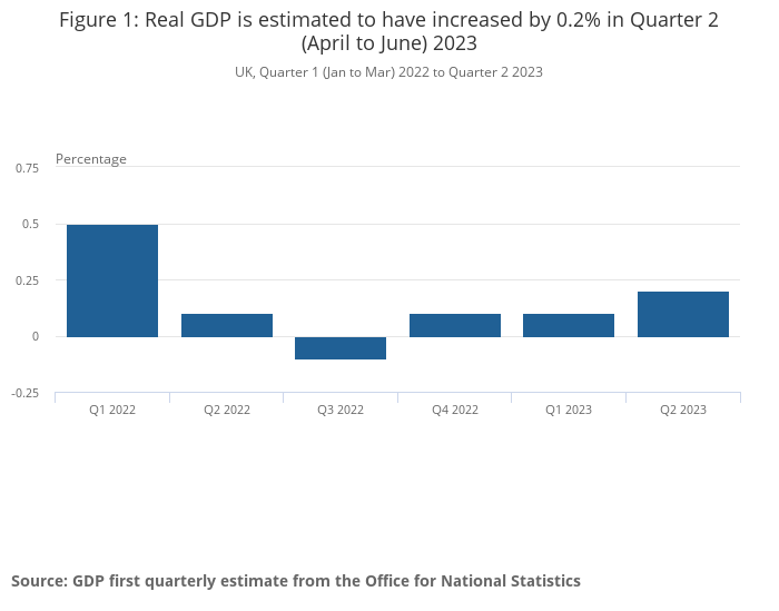 The first quarterly estimate of UK real gross domestic product (GDP) shows that the economy increased by 0.2% in Quarter 2 (Apr to June) 2023 (Figure 1). This follows growth of 0.1% in the previous quarter. The level of quarterly GDP in Quarter 2 2023 is now 0.2% below its pre-coronavirus (COVID-19) level in Quarter 4 (Oct to Dec) 2019. Compared with the same quarter a year ago, GDP is estimated to have increased by 0.4%.