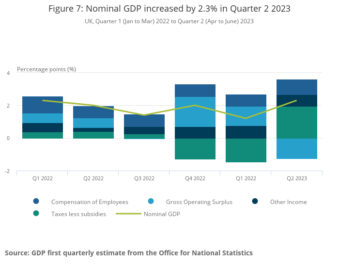 Nominal gross domestic product (GDP) rose by 2.3% in Quarter 2 (Apr to June) 2023, and increased by 7.1% relative to the same quarter last year. The quarterly rise was driven by growth in compensation of employees and taxes less subsidies (Figure 7).
