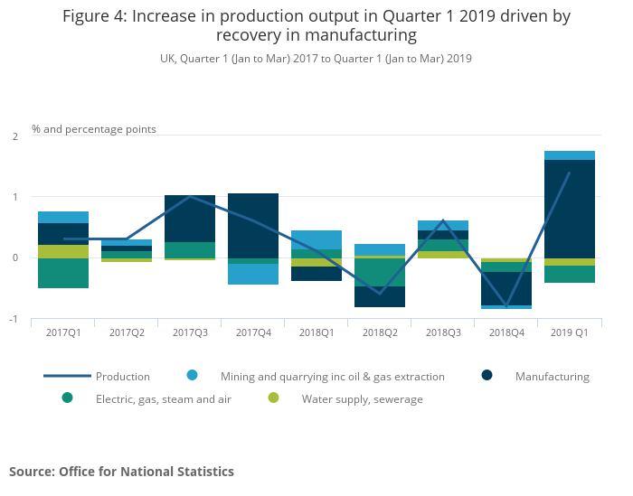 Image .csv .xlsFollowing a weak picture in Quarter 4 2018, in which all of the four main areas of production experienced a fall in output, there was a pickup in Quarter 1 2019. Production output increased by 1.4% (Figure 4), predominantly driven by manufacturing output, which increased by 2.2%, its fastest rate since Quarter 3 (July to Sept) 1988.