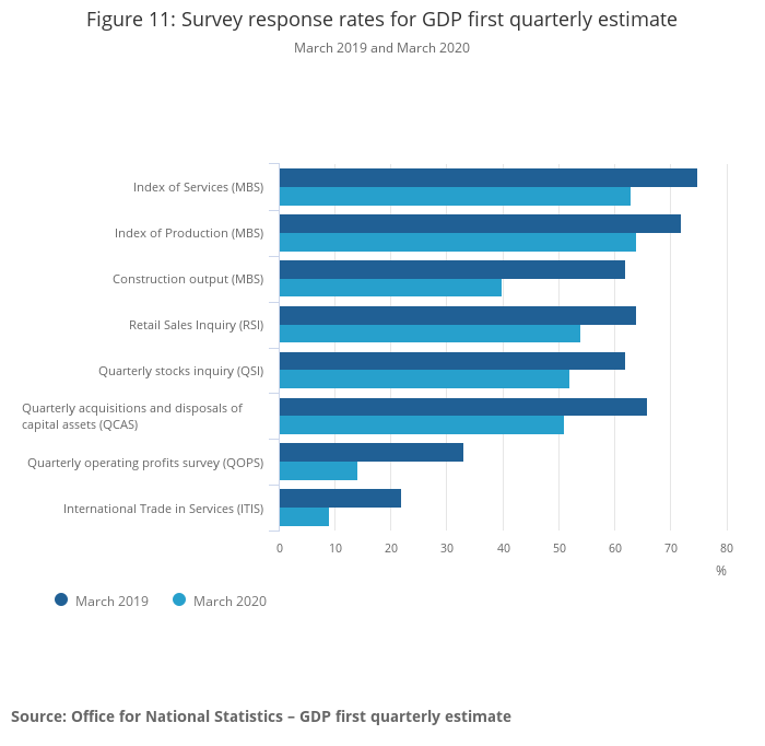 Image .csv .xlsFigure 11 highlights a decline in response rates for surveys that feed into the GDP first quarterly estimate for Quarter 1 2020. We have undertaken a significant amount of work to ensure that the effect on the quality of estimates in this release are mitigated as much as possible. These include focusing resources on main respondents and industries, methodology reviews including but not limited to seasonal adjustment, forecast and imputation, and the utilisation of additional sources of data (in quality assurance). More information on the measures taken can be found in Section 6 of Coronavirus and the effects on UK GDP.