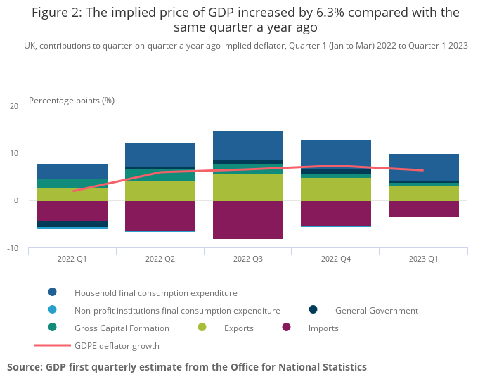 UK, contributions to quarter-on-quarter a year ago implied deflator, Quarter 1 (Jan to Mar) 2022 to Quarter 1 2023