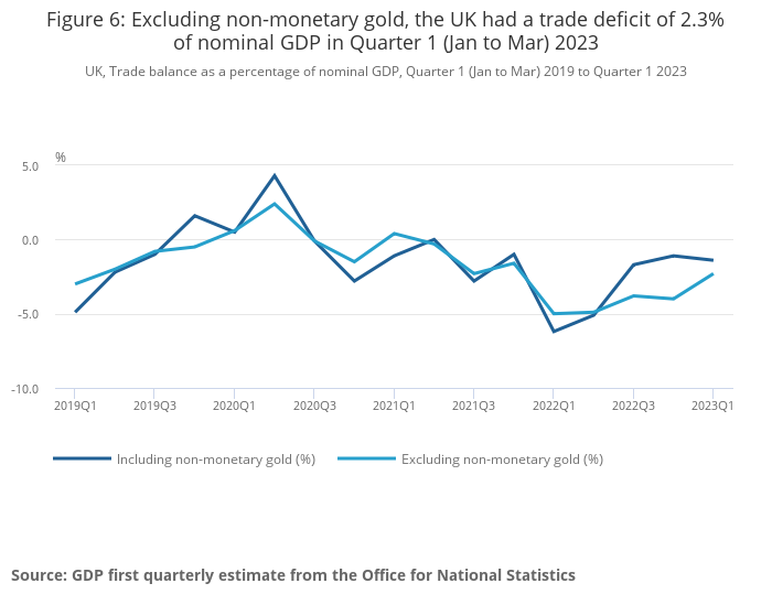Figure 6: Excluding non-monetary gold, the UK had a trade deficit of 2.3% of nominal GDP in Quarter 1 (Jan to Mar) 2023