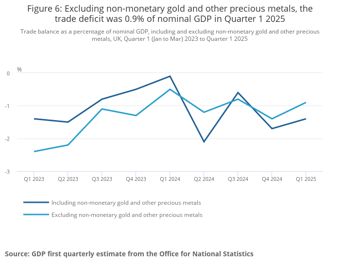 The UK's trade deficit for goods and services was 1.4% of nominal GDP in Quarter 1 2025. However, this includes non-monetary gold and other precious metals, which is an erratic series. It can be useful to exclude this from the trade balance. Excluding non-monetary gold and other precious metals, the trade deficit was 0.9% of nominal GDP in Quarter 1 2025 estimate (Figure 6).