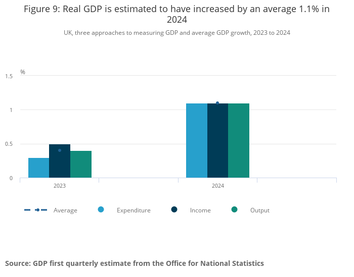 UK, three approaches to measuring GDP and average GDP growth, 2023 to 2024