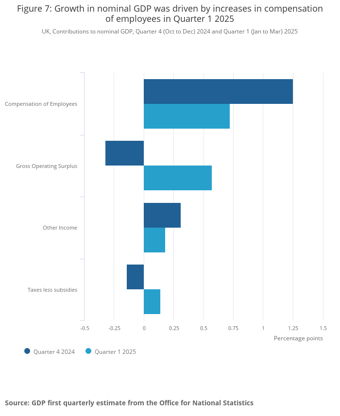 Nominal gross domestic product (GDP) grew by 1.6% in Quarter 1 (Jan to Mar) 2025 and is up 5.8% compared with the same quarter a year ago. Growth in nominal GDP was mainly driven by increases in compensation of employees (Figure 7).