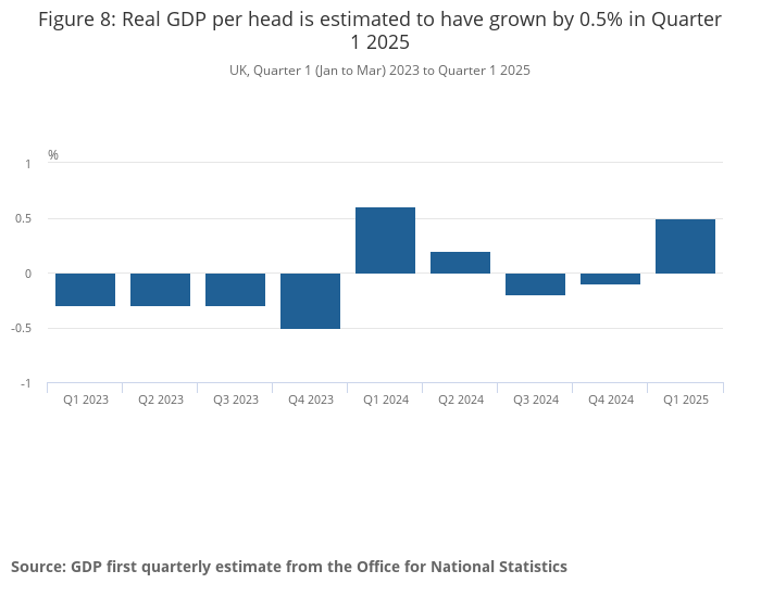 Real GDP per head is estimated to have grown by 0.5% in Quarter 1 2025, following two consecutive quarterly falls.