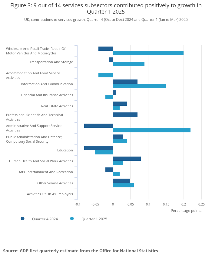 UK, contributions to services growth, Quarter 4 (Oct to Dec) 2024 and Quarter 1 (Jan to Mar) 2025