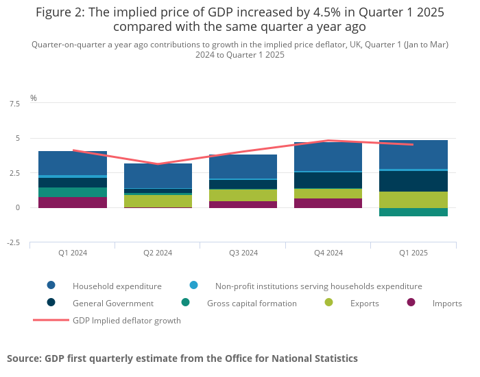 Quarter-on-quarter a year ago contributions to growth in the implied price deflator, UK, Quarter 1 (Jan to Mar) 2024 to Quarter 1 2025