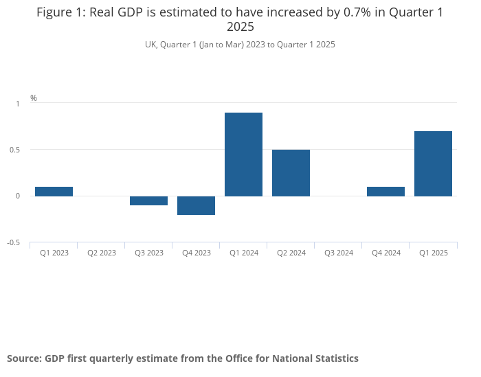 UK gross domestic product (GDP) is estimated to have grown by 0.7% in Quarter 1 (Jan to Mar) 2025, following growth of 0.1% in the previous quarter.