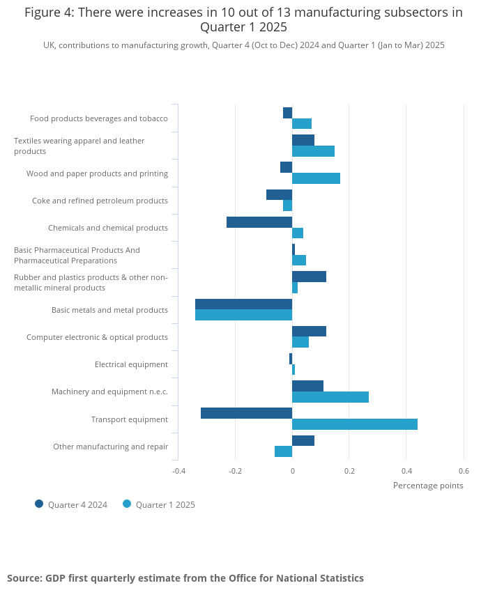 UK, contributions to manufacturing growth, Quarter 4 (Oct to Dec) 2024 and Quarter 1 (Jan to Mar) 2025