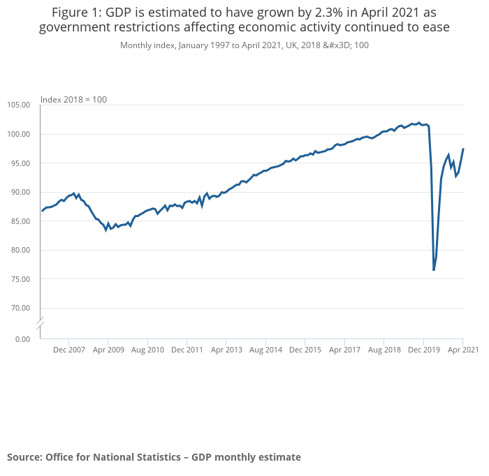 - UK gross domestic product (GDP) is estimated to have grown by 2.3% in April 2021, the fastest monthly growth since July 2020, as government restrictions affecting economic activity continued to ease.
