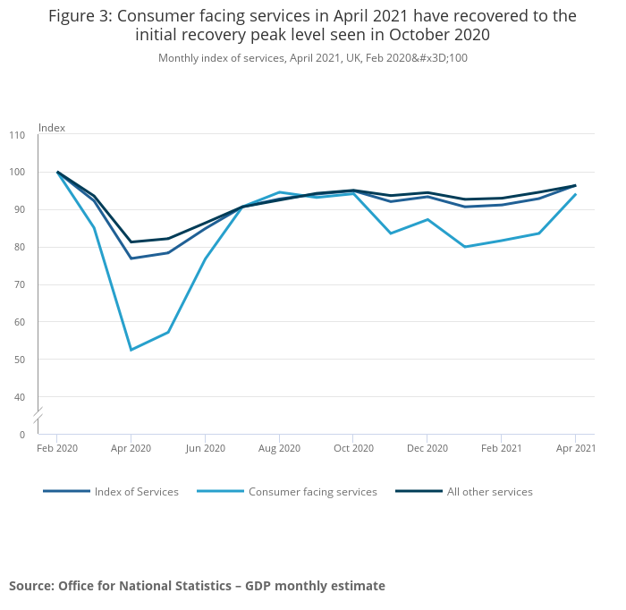 - The service sector grew by 3.4% in April 2021, with consumer-facing services re-opening in line with the easing of coronavirus restrictions and more pupils returning to onsite lessons.