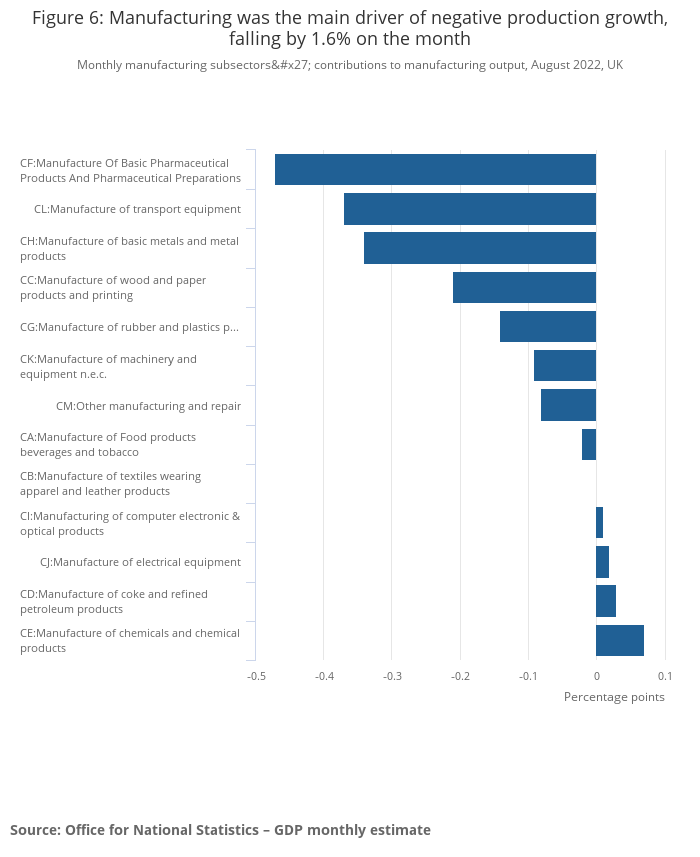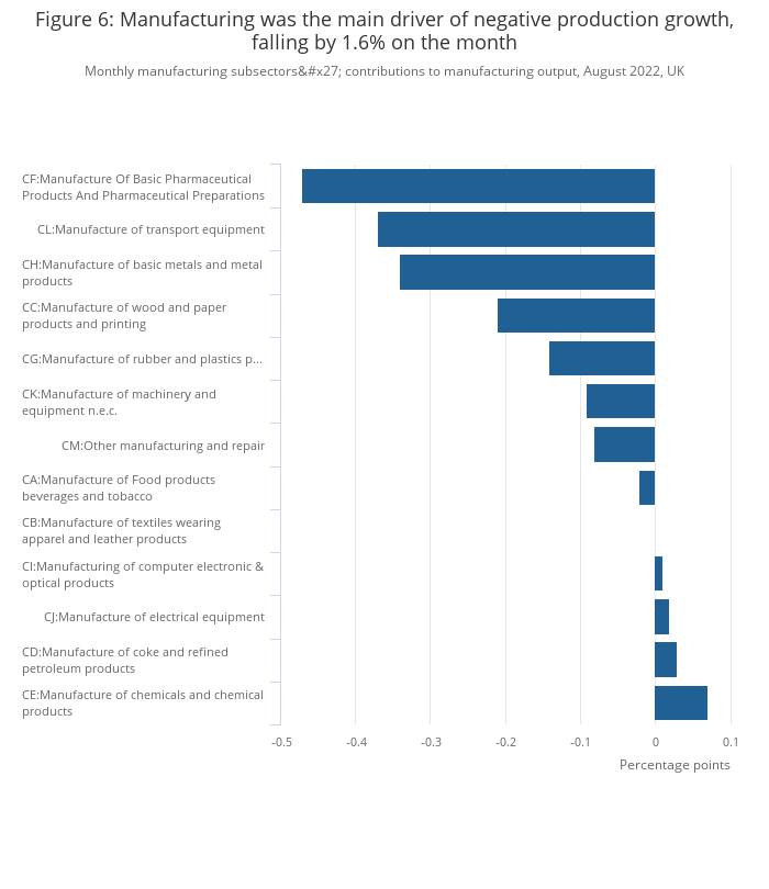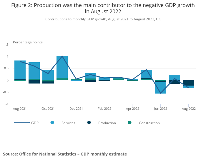 Production fell by 1.8% in August 2022 after a fall of 1.1% in July 2022 (revised down from a fall of 0.3% in our previous publication) and was the main contributor to the fall in GDP; this fall was mainly because of a decrease of 1.6% in manufacturing.