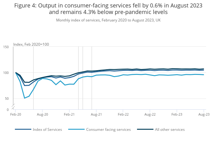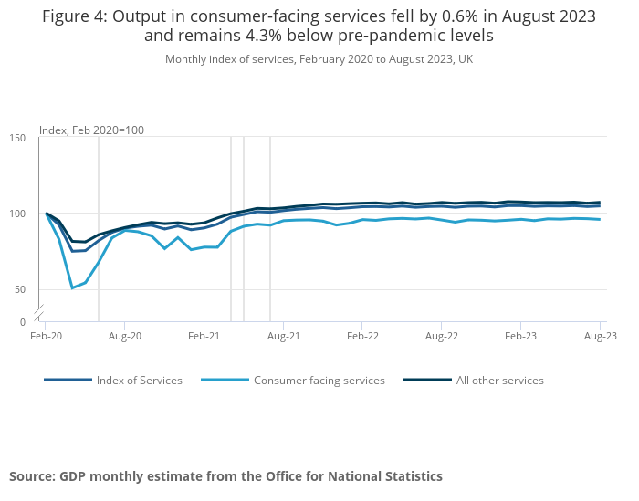 Figure 4: Output in consumer-facing services fell by 0.6% in August 2023 and remains 4.3% below pre-pandemic levels