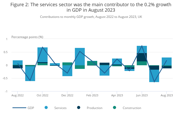 Services output rose by 0.4% in August 2023 and was the main contributor to the growth in GDP.