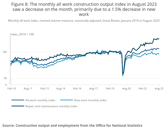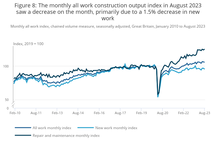 Download this chart Figure 8: The monthly all work construction output index in August 2023 saw a decrease on the month, primarily due to a 1.5% decrease in new work
