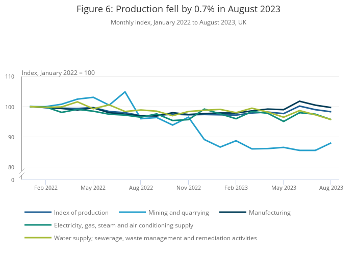 Image .csv .xlsMore detailed breakdowns on production are available in the Index of Production, UK: August 2023.