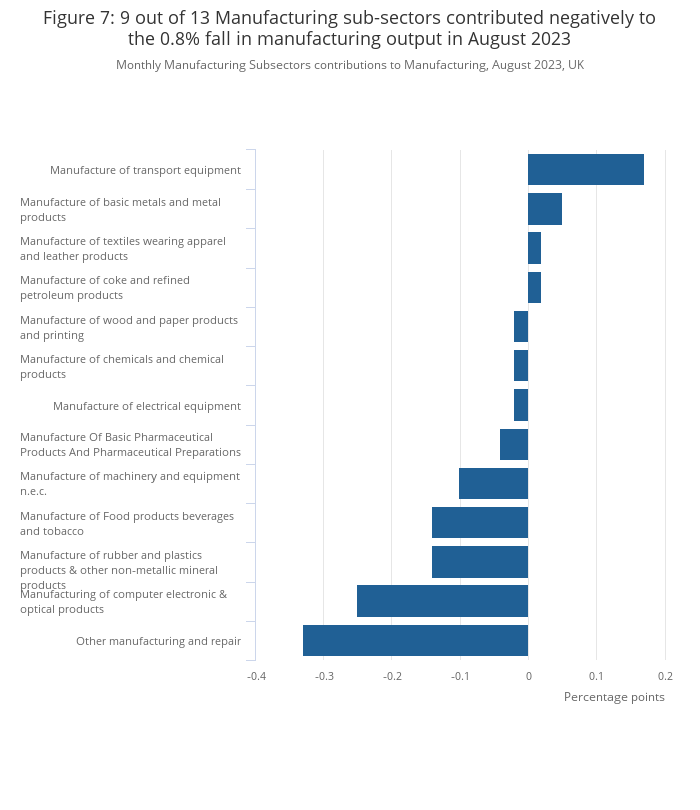 Other manufacturing and repair was the main driving industry within manufacturing, falling by 3.4% in August 2023, followed by manufacture of computer, electronic and optical products, which fell by 3.2% in the month. The largest offsetting positive contribution within manufacturing came from the manufacture of transport equipment, for which output rose by 1.1% in August 2023 (Figure 7).