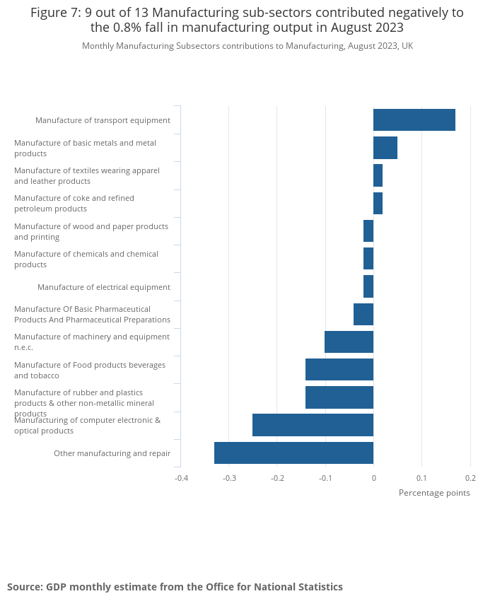 Monthly Manufacturing Subsectors contributions to Manufacturing, August 2023, UK