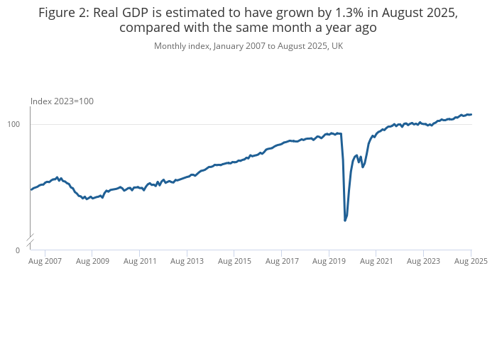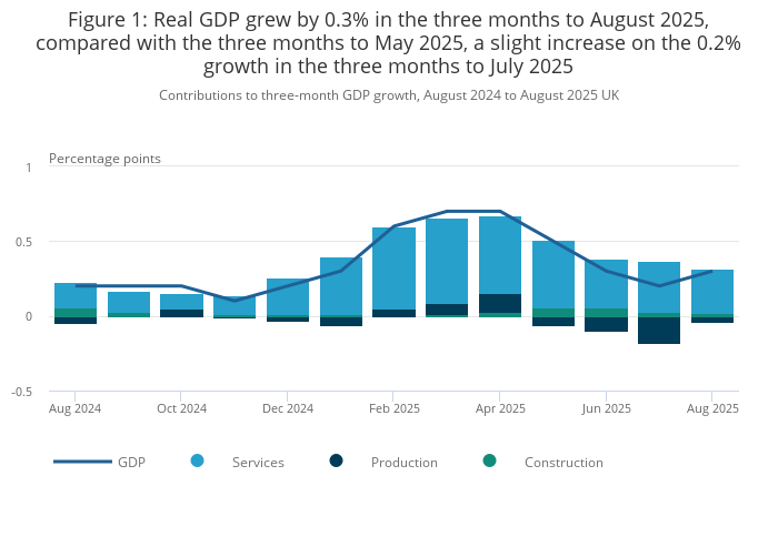 Over the longer term, GDP is estimated to have grown by 1.5% in the three months to August 2025, compared with the same three months a year ago. Over this period, services grew by 1.8%, construction grew by 1.3%, and production fell by 0.4%.