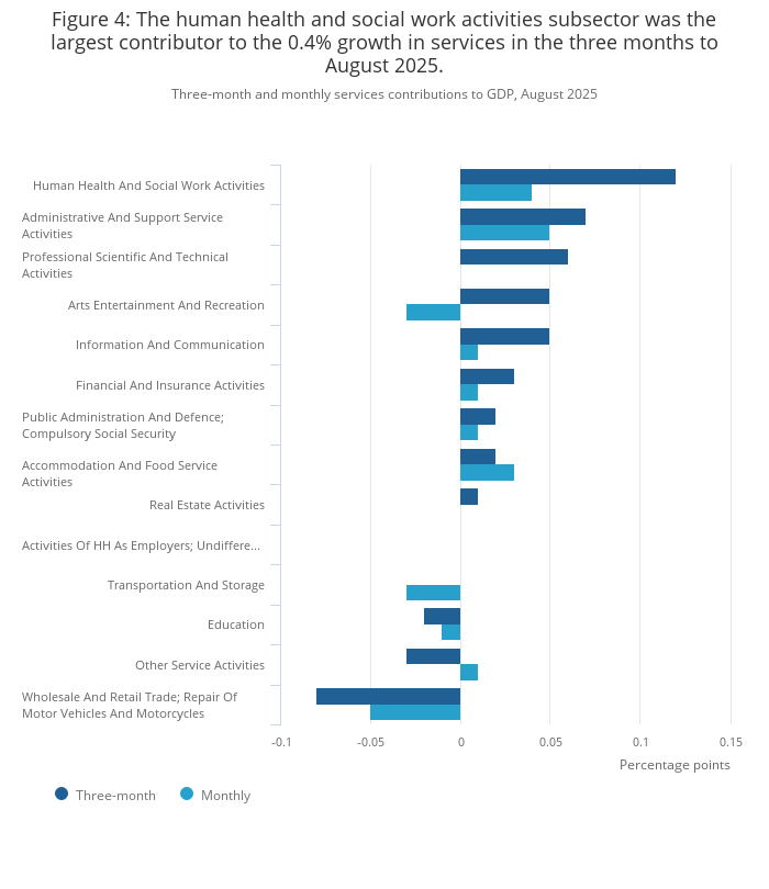 Download this chart Figure 4: The human health and social work activities subsector was the largest contributor to the 0.4% growth in services in the three months to August 2025.