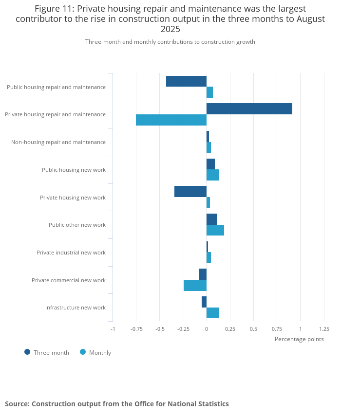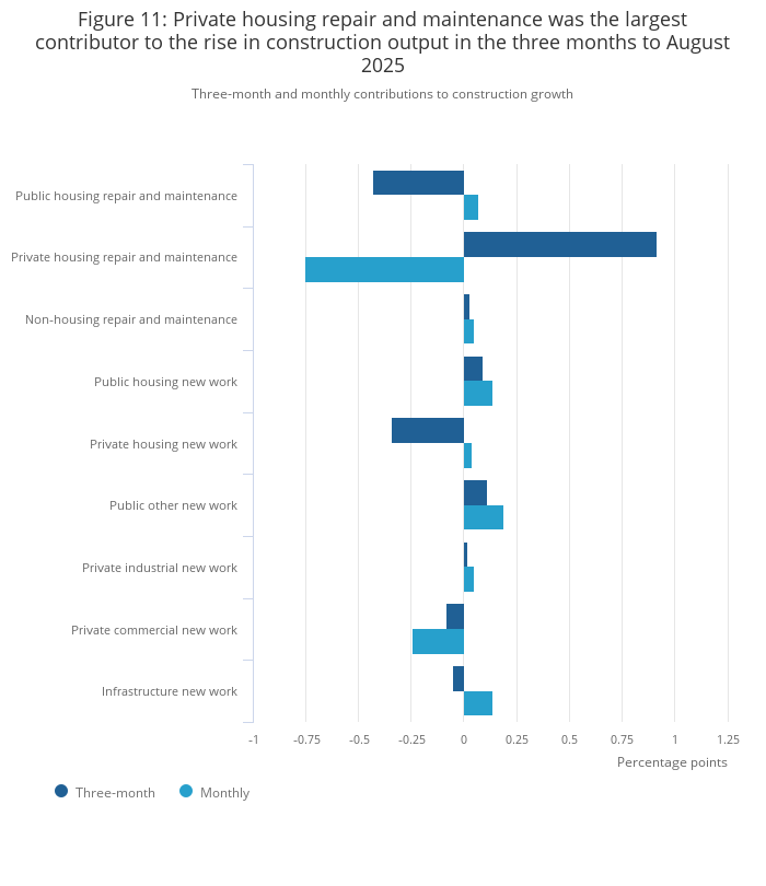 Construction output is estimated to have increased by 0.3% in the three months to August 2025 compared with the three months to May 2025. Repair and maintenance increased by 1.3%, and new work fell by 0.4% over the period. Within repair and maintenance, the largest positive contributor came from private housing repair and maintenance which grew by 5.6%. In new work, the largest negative contributor came from private housing new work, which fell by 1.8%.