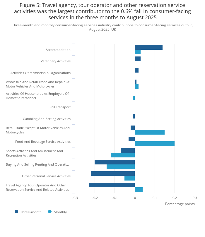 Download this chart Figure 5: Travel agency, tour operator and other reservation service activities was the largest contributor to the 0.6% fall in consumer-facing services in the three months to August 2025