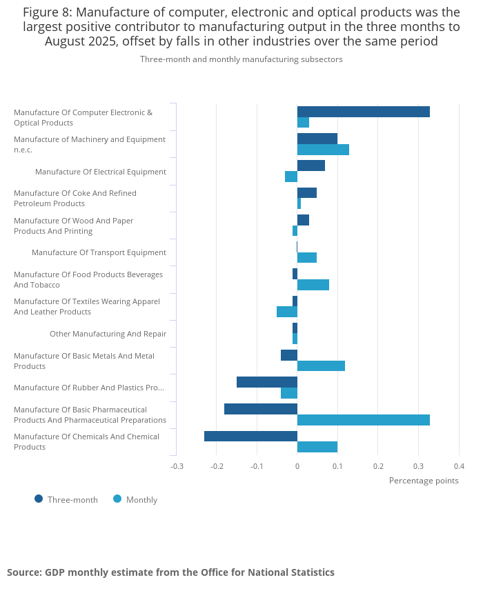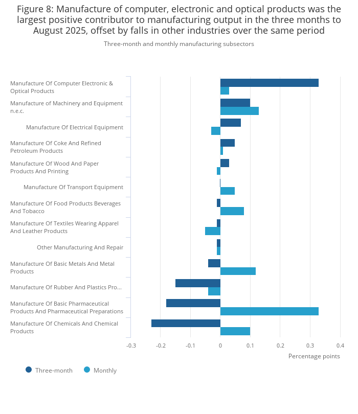 Figure 8: Manufacture of computer, electronic and optical products was the largest positive contributor to manufacturing output in the three months to August 2025, offset by falls in other industries over the same period