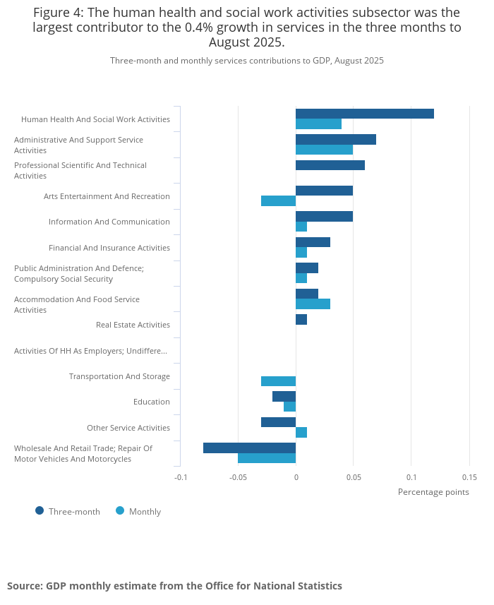 Figure 4: The human health and social work activities subsector was the largest contributor to the 0.4% growth in services in the three months to August 2025.