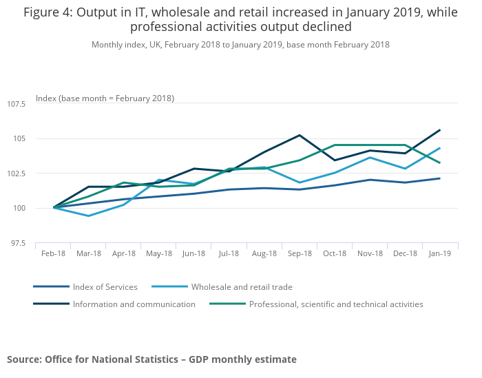 Figure 4: Output in IT, wholesale and retail increased in January 2019, while professional activities output declined