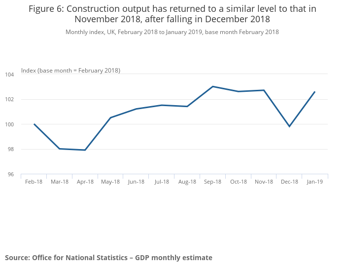 - Monthly growth in construction bounced back in January 2019 after negative growth in December 2018