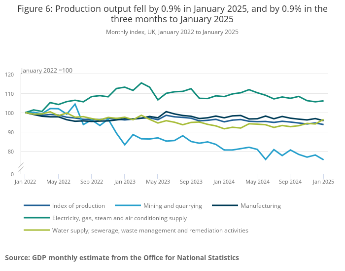 Production output fell by 0.9% in January 2025, following growth of 0.5% in December 2024, and fell by 0.9% in the three months to January 2025, with manufacturing output driving both the monthly and three-month falls.