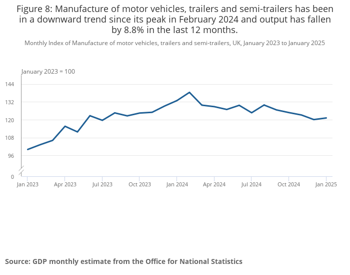 Monthly Index of Manufacture of motor vehicles, trailers and semi-trailers, UK, January 2023 to January 2025