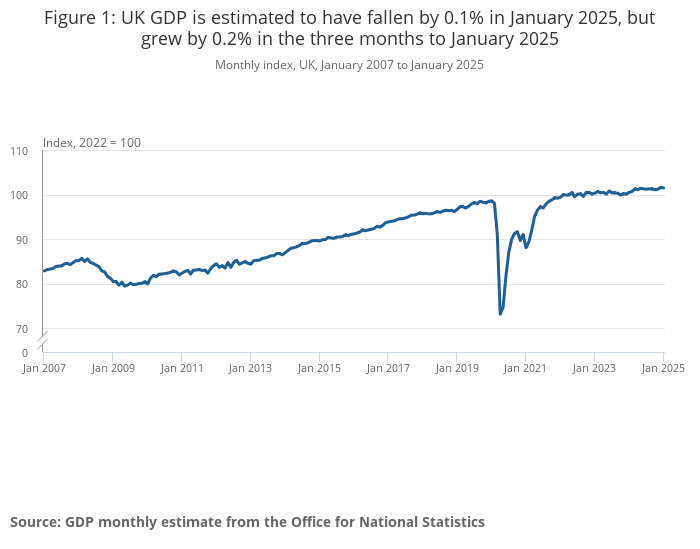 Figure 1: UK GDP is estimated to have fallen by 0.1% in January 2025, but grew by 0.2% in the three months to January 2025