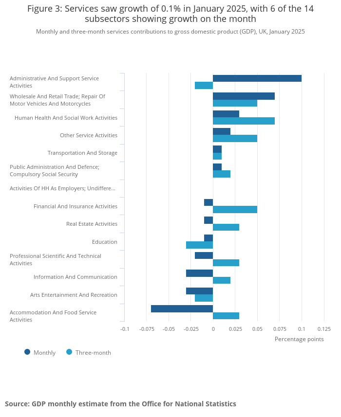 Monthly services output grew by 0.1% in January 2025, following growth of 0.4% in December 2024, and grew by 0.4% in the three months to January 2025.