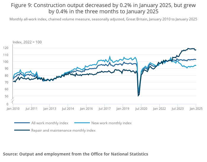 Construction output fell by 0.2% in January 2025, following a fall of 0.2% in December 2024, but grew by 0.4% in the three months to January 2025.
