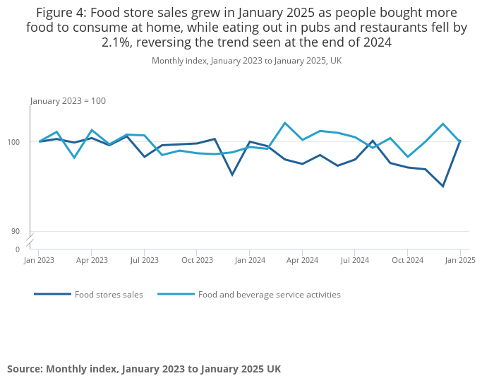 Figure 4: Food store sales grew in January 2025 as people bought more food to consume at home, while eating out in pubs and restaurants fell by 2.1%, reversing the trend seen at the end of 2024