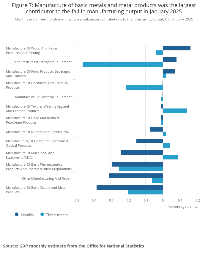 Download this chart Figure 7: Manufacture of basic metals and metal products was the largest contributor to the fall in manufacturing output in January 2025
