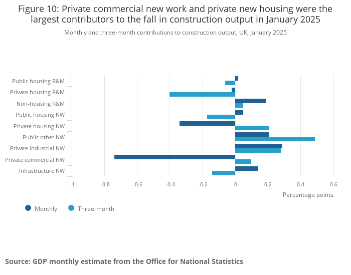 Figure 10: Private commercial new work and private new housing were the largest contributors to the fall in construction output in January 2025