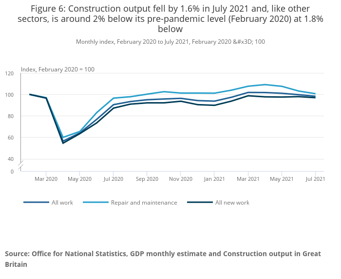 - Construction contracted for a fourth consecutive month, with output down by 1.6% in July 2021, and is now 1.8% below its pre-pandemic level (February 2020).