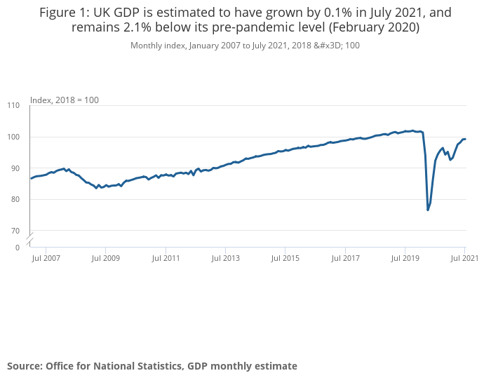 Figure 1: UK GDP is estimated to have grown by 0.1% in July 2021, and remains 2.1% below its pre-pandemic level (February 2020)