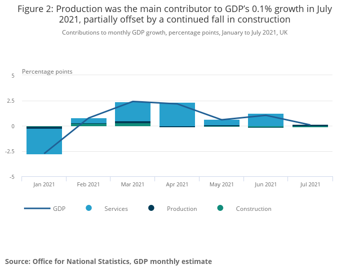 Figure 2: Production was the main contributor to GDP’s 0.1% growth in July 2021, partially offset by a continued fall in construction