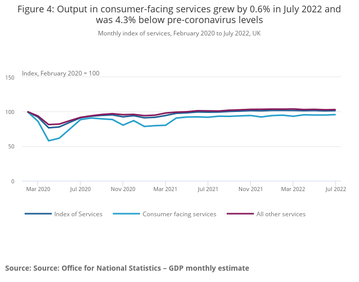 Output in consumer-facing services grew by 0.6% in July 2022, following flat growth in June 2022; consumer-facing services remained 4.3% below their pre-coronavirus (COVID-19) levels (February 2022) in July 2022.