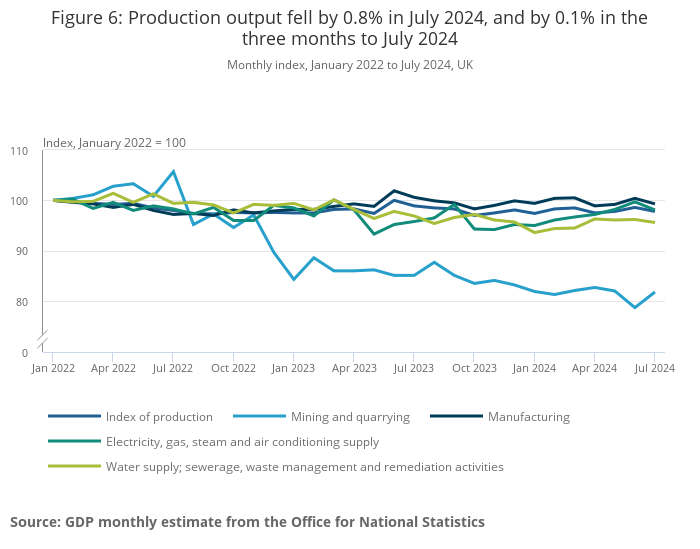 In the three months to July 2024, production output is estimated to have decreased by 0.1% when compared with the three months to April 2024. This was mainly caused by a 0.3% decrease in manufacturing output in this period, while mining and quarrying also decreased, by 1.4%. These falls were partially offset by a growth of 2.1% in electricity, gas, steam and air conditioning supply and a 0.9% growth in water supply, sewerage, waste management and remediation activities in the three months to July.