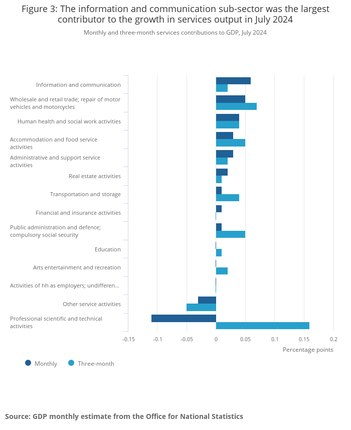 Professional, scientific and technical activities was the largest positive contributor to the rise in services output in this three-month period, increasing by 2.0% in the three months to July 2024. The next largest contribution came from wholesale and retail trade; repair of motor vehicles and motorcycles, where output increased by 0.7%.