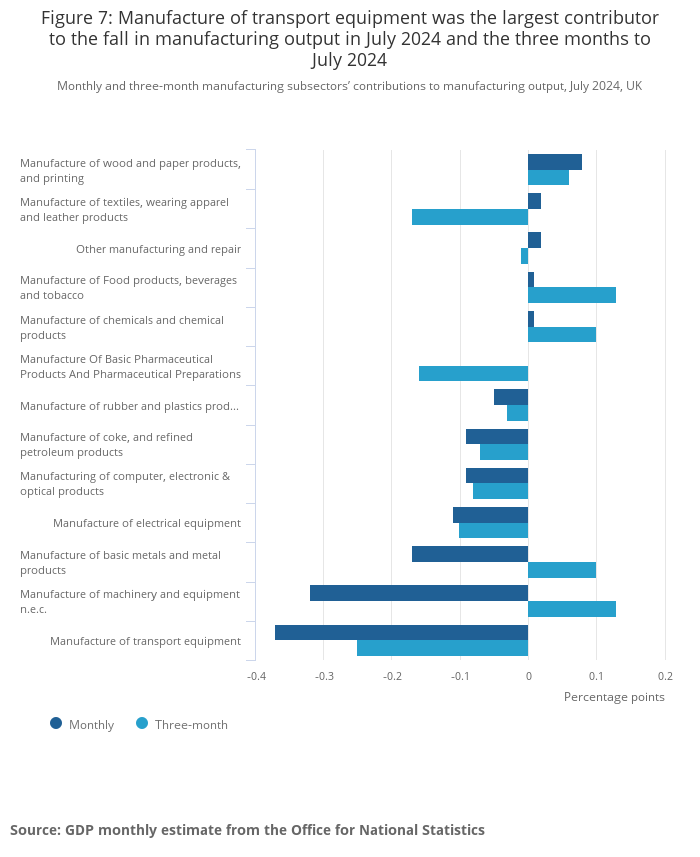 Figure 7: Manufacture of transport equipment was the largest contributor to the fall in manufacturing output in July 2024 and the three months to July 2024