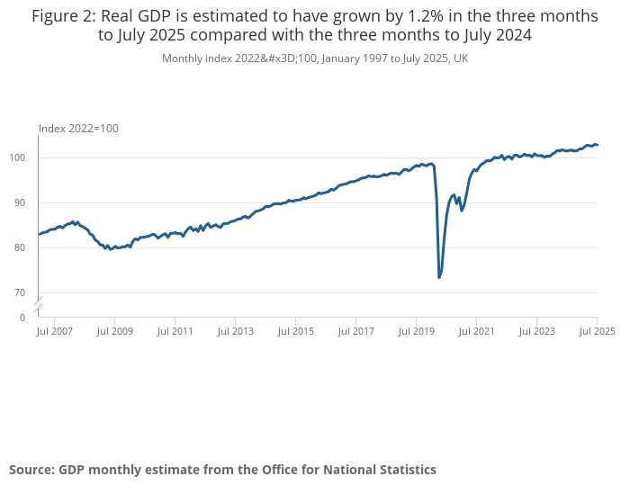Looking over the longer term, GDP is estimated to have grown by 1.2% in the three months to July 2025, compared with the same three months a year ago. Over this period services grew by 1.3%, construction grew by 1.8%, and production showed no growth.